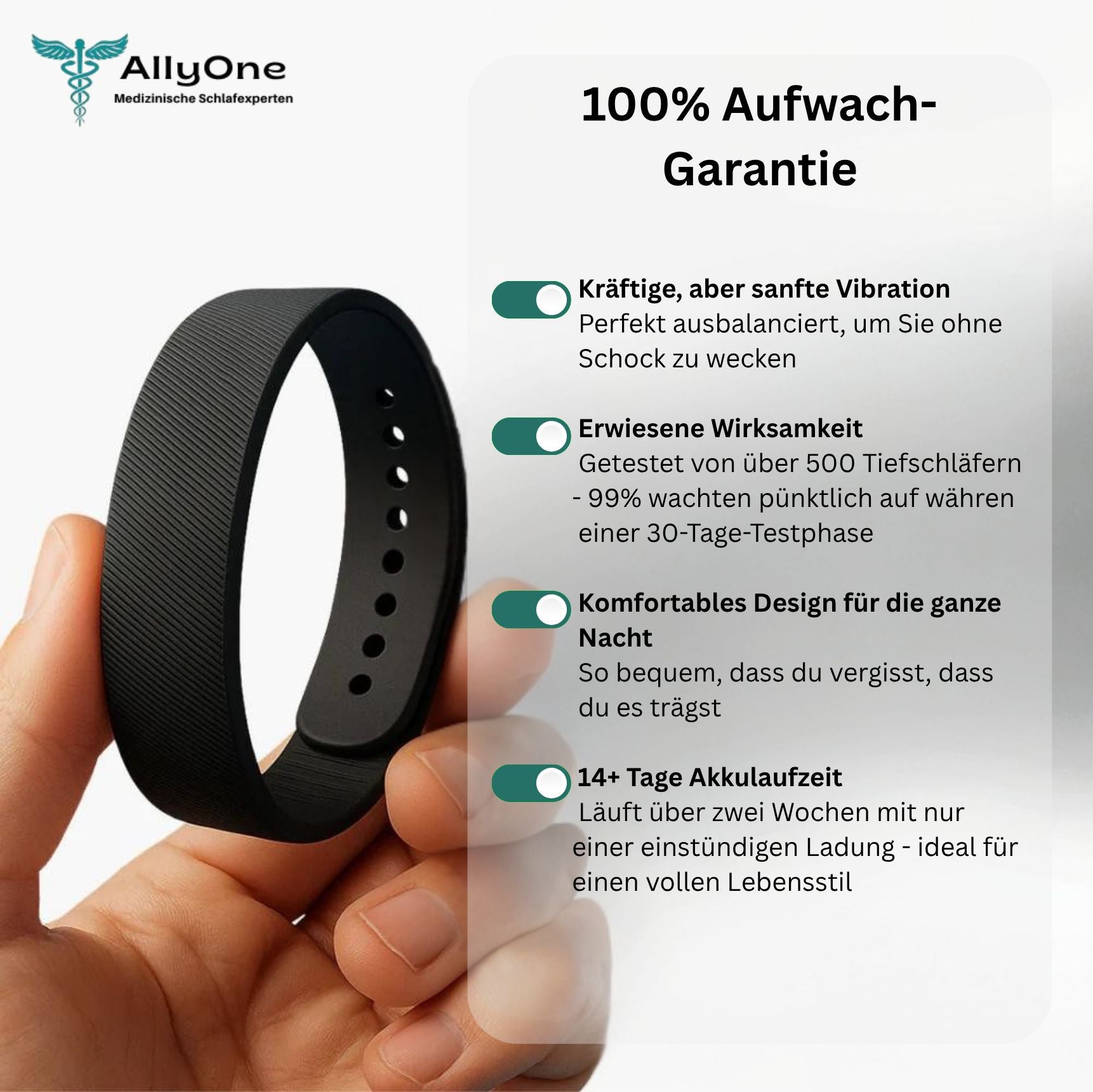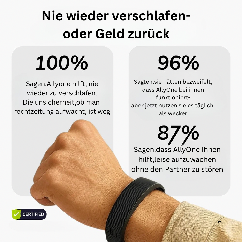 Der ALLYONE -Wecker weckt Sie lautlos mit sanften Vibrationen am Handgelenk, sodass Sie alleine, ruhig und natürlich aufwachen, ohne Geräusche oder Bildschirme.